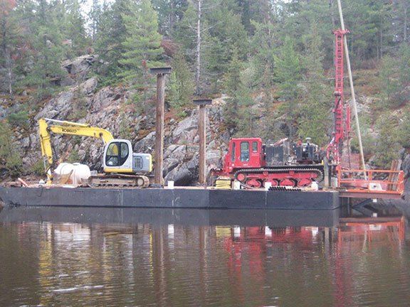 When it comes to work on water, Walker Drilling has several options available. We own and operate our own small barge, which can be easily brought to and assembled on-site. This barge is useful on small bodies of water, tailings ponds, dam reservoirs and other places where the water conditions are relatively calm. This barge can handle the D25 drill or a tripod set-up.